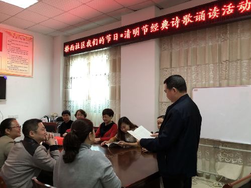 为继承革命传统,缅怀革命先烈,弘扬爱国主义精神,引导大家树立正确的人生观、价值观。4月3日下午,桥西社区组织社区居民开展以 “我们的节日·清明节”为主题的诗歌朗诵活动。通过这些诗词表达对逝去亲人的思念,传递文明祭祀的正能量,缅怀先贤启后人。