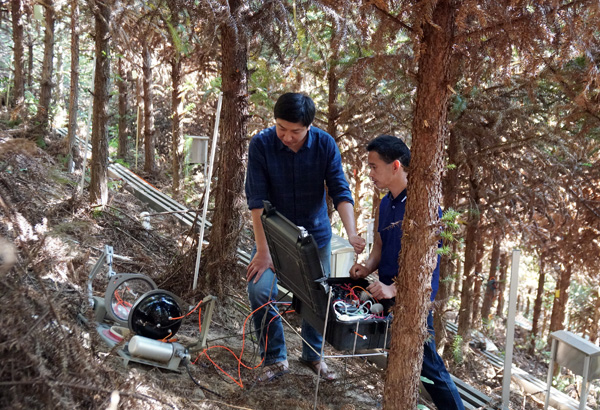 三明站技术人员对土壤增温平台系统运行进行日常检查 目前,三明野外观测研究站有固定科研人员27人,其中国家“万人计划”科技创新领军人才2名、国家杰青2人、国家优青5人。积累了5年以上的长期监测数据,包括气象、植被、水文、生物多样性、土壤理化性质、微生物及土壤动物、温室气体排放等数据集,共计对100多个要素进行监测。自2010年以来,保存土壤、植物样品及标本共5万多份。今年10月中旬,三明野外观测研究站也正在申报国家野外观测研究站。 专注创新,科研更加自动化 科学研究,离不开先进仪器设备的支撑。 在格氏栲附近的模拟全球气候变化实验平台站点,记者看到人工杉木林地面上布设着大量自动化监测仪器。 这种仪器是科研团队自主研发的最新产品,是由一套微型气象站和一台控制主机以及两个配对的自动化终端组成的“四件套一组”森林土壤碳汇监测设备。该仪器能自动用“并行方式”实现同一时间监测多个不同空间点的土壤碳交换速率,是集环境要素及碳循环数据于一体的分布式观测系统。 据介绍,原先这里采用的是进口的土壤碳通量监测仪,不仅价格昂贵,而且只能通过“轮询方式”监测,造成不同监测点的时间同步性差,而且仪器防水性不佳、维护费时费力费人工。同时,由于科研实验设备用量大,只靠外国进口需大量资金投入,因此自主研发才是开展大规模研究的突破口。 2012年开始,三明野外观测研究站博士陈仕东开始专注森林碳汇监测设备自主创新设计,用材从有机玻璃到不锈钢再到航空铝镁合金,前后用了4年多时间共改进5个版本。他介绍:“现在自主研发的专利碳汇监测设备,具有国际上首创的多点同步监测技术,而且还有防水、防虫、自动诊断报警等功能,还可以通过物联网远程集中管理维护,这些独有的技术使得这些仪器能够在高温、高湿、多虫的湿润亚热带森林长期无人值守稳定运行。”