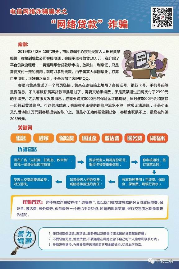 2019年12月16日, 我市又发生“网络贷款”类诈骗6起 其中,永安2起,泰宁2起 三元1起,沙县1起 已经说过无数次的事情 可还是有人选择网上贷款 网络贷款虽方便快捷吸引人 但这往往是骗局的开始 如果一不小心踩入坑中 “客服人员”、“审核员” 一齐上阵层层设套 “平台费”、“保险费”、“保证金” “解冻费”、“验证费” 道道手续,连番“轰炸” 当心钱没贷到,存款也没了 案例 一天,小王手机上收到一条借贷短信“贷款,秒审核、下款快,无需等待,加扣179****68详询”想着自己确实有点“手头紧”,就添加了对方的QQ。 加了QQ后,对方声称自己是某贷款平台客服,在介绍了平台贷款流程后,一再强调平台贷款秒审核,放款快,只是需要支付一定的费用,就可以拿到钱款。小王觉得花点手续费也没事,能快速办下来就好了,于是提出想要贷款5万元。 “这是我们平台APP链接,你先申请,审核通过后收取一部分平台费,审核不通过不收费。”客服向小王发来链接。于是,小王在贷款审批通过后,通过扫码支付了1399元的平台费。
