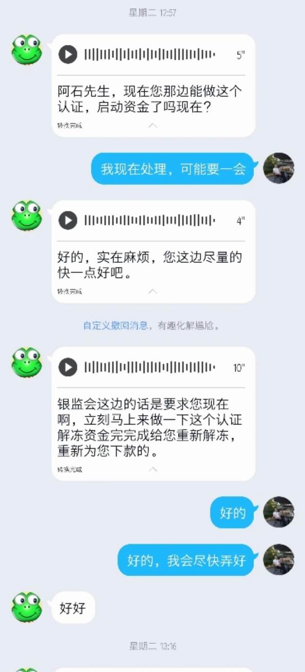 谁知,APP再次提示要客服提供验证码,客服说石先生操作失误,资金又被冻结了,要再交7万元保证金才能解冻,随后石先生按对方提供不同的三个银行账户,分三次将7万元转账到对方账户,7万元转完后,客服要求石先生再交5万元保证金,石先生没钱了才发现不对劲,便来到公安局报案了。