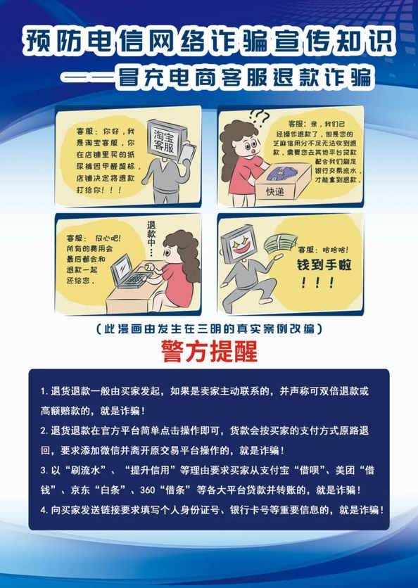 案件类型 虚假交易(游戏充值)2起,冒充客服4起,冒充QQ好友1起,网络贷款1起;冒充客服发案数及涉案金额最多,达44500元,占71.8%。 发案区域 城关街道3起,荆西街道(三明学院)2起,白沙街道、中村乡、岩前镇各1起。 常见诈骗手法之冒充客服退赔类诈骗 诈骗分子通过非法渠道获取受害人网购等信息,冒充网店客服给受害人打电话,称其网购的商品因各种原因不能按时送达(如:快件丢失、质量有问题、缺货),但可以帮助受害人办理退款事宜,发送钓鱼网站链接给受害人,诱骗受害人在网页上输入身份信息、银行卡信息和验证码等,随后将受害人银行卡内的欠款转走。 警方提醒 遇到网购客服通过电话、短信联系,大家一定要提高警惕,对方索要银行卡、密码、验证码等一律不提供,若订单或物品真的存在疑问,建议通过网购平台等正规渠道向客服求证。如不慎被骗,请保存好聊天截图、转账记录,向警方寻求帮助。