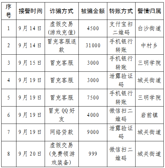 9月14日-20日,三元区发生电信网络诈骗案件8起,涉案金额62999元,环比(9月7日-13日,发案9起,涉案金额474502万元)发案率下降11.1%,涉案金额下降86.7%。