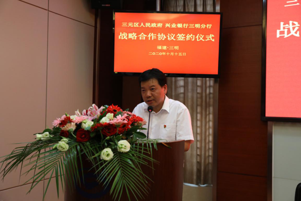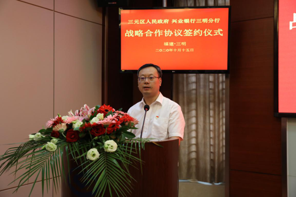 区长廖卫国发表致辞 罗敦颖对三元区人民政府长期以来对兴业银行三明分行的有力支持表示感谢。他表示,兴业银行三明分行将聚焦合作协议的深化落实和助力“六稳”“六保”的系列金融服务专项行动,为三元区重大任务、重大改革、重大项目、重大民生提供高效优质的金融服务,推动双方合作结出更加丰硕的果实。