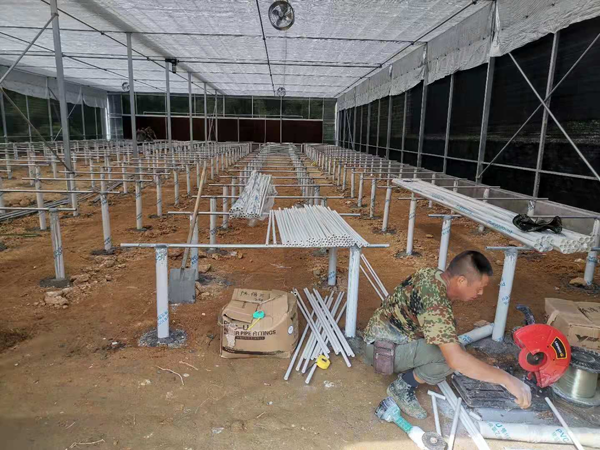 连日来,在中村乡中村村焙坑,兰花基地大棚建设项目中的3个大棚主体结构都已完成,工人们正抓住晴好天气,进行兰床建设及喷灌设施建设。目前已完成总工程量的80%,力争在本月底该项目全部完工投入使用。