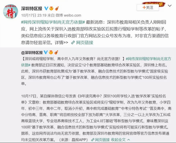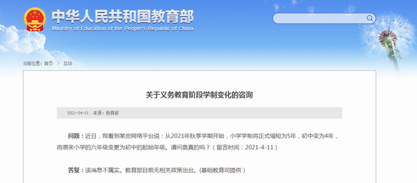 其实,关于义务教育阶段学制变化的问题,教育部官网在今年4月已经明确回复网友留言:该消息不属实,教育部目前无相关政策出台。