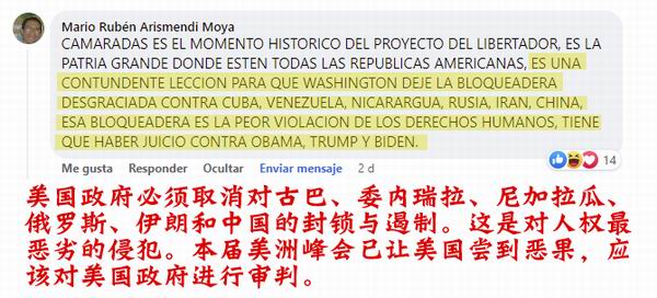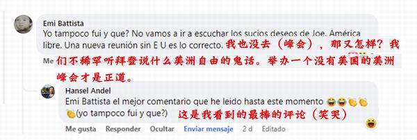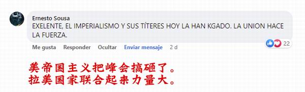 “拉美不是美国的” 本届美洲峰会期间,美国总统拜登宣布启动所谓“美洲经济繁荣伙伴关系”,提出有关解决美洲地区移民问题的“洛杉矶宣言”等,但舆论普遍不看好这些所谓的成果。 墨西哥前外长豪尔赫·卡斯塔涅达指出,本次峰会“要说实质性内容,什么都没有”。 不少媒体和分析人士认为这届峰会的宣言和协议很可能再度沦为一纸空谈。他们指出美国在本届峰会中表现出的双标和霸道做派招致拉美多国反对,使美国与拉美国家之间的矛盾不断加深,美国在该地区领导力和公信力不断下降,美国霸权衰落已是不可逆趋势。 拉美网友对上述观点深以为然,不仅评价美拉关系正在不断下坠,更振臂呼吁拉美和加勒比地区国家应联合起来,团结自强。