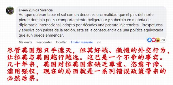 一些拉美网友甚至直截了当喊话美国:“休想只手遮天!”在他们看来,将拉美作为“后院”并发号施令的时代已经过去了。美国是时候摈弃“门罗主义”情结和霸道主义做派、停止对拉美国家的霸凌胁迫和封锁制裁了。因为,时代已经不同了。