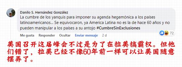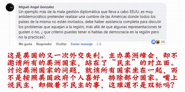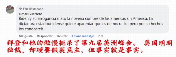 “本届美洲峰会已让美国尝到恶果” 本届峰会召开之前,主办国美国单方面宣布,因所谓“民主问题”,将不邀请古巴、尼加拉瓜和委内瑞拉领导人参会。委内瑞拉总统马杜罗坦言:“正是美国政府自己捅了美洲峰会一刀,把它搞砸了。” 拉美网友纷纷在海外社交媒体上留言“补刀”。他们给美国政府贴上了“独裁”“假民主”“侵犯人权”等标签,认为此次洛杉矶峰会得不到大家的“祝福”,实乃美国自食恶果、自作自受。