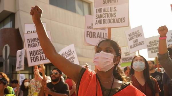 6月10日,民众在美国加利福尼亚州洛杉矶举行游行,抗议美国的外交政策。新华社发 会场内,美国的排他性政策引发众怒,“成就”了历届美洲峰会上领导人出席率的最低记录,不少与会者直言“参加峰会就是为了把抗议的声音带到会场”。 会场外,上千名示威者高呼口号,反对美国政府对古巴等拉美国家的制裁,拉美各国网友更是在海外社交媒体上火力全开,花式吐槽美国,观点犀利火辣。