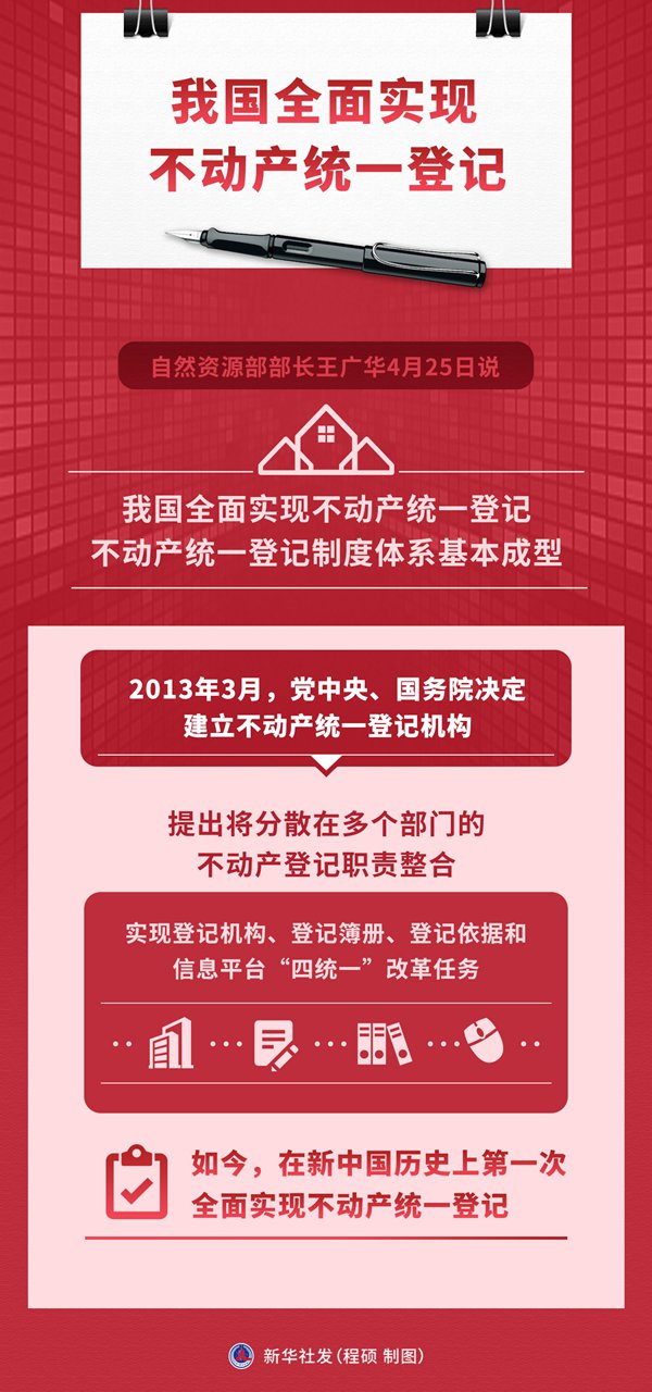 新华社成都4月25日电(记者王立彬)自然资源部部长王广华25日说,经过十年不懈努力,我国全面实现不动产统一登记,不动产统一登记制度体系基本成型。 王广华在此间召开的全国自然资源和不动产确权登记工作会议上说,2013年3月,党中央、国务院决定建立不动产统一登记机构,提出将分散在多个部门的不动产登记职责整合,实现登记机构、登记簿册、登记依据和信息平台“四统一”改革任务。各级不动产登记机构坚决贯彻党中央、国务院决策部署,以踏石留印、抓铁有痕的劲头,把蓝图变成了现实,如今,在新中国历史上第一次全面实现不动产统一登记。 据介绍,目前全国约3000个大厅、4万个窗口、10万人的登记队伍,每天为40万群众和企业提供各类登记服务,10年来累计颁发不动产权证书7.9亿多本、不动产登记证明3.6亿多份,电子证书证明3.3亿多本;通过推行“跨省通办”“交房即交证”“带押过户”等便民利民举措,实现“一窗、一网、一次”甚至“不见面”办证,一般登记和抵押登记实现5个工作日内办结,较2015年压缩83%。 我国全面完成易地扶贫搬迁安置住房不动产登记,全国258.18万套建档立卡户安置住房实现“应登尽登”,960万搬迁群众拿到“红本本”,吃下“定心丸”;推动化解历史遗留问题,解决了1100多万套房屋办证问题,惠及2600多万群众;基本完成农垦国有土地确权登记,登记面积4.13亿亩,登记率达96.2%,释放了国有农垦改革发展活力。 王广华说,我国不动产登记从分散到统一,从城市房屋到农村宅基地,从不动产到自然资源,覆盖所有国土空间,涵盖所有不动产物权,积极服务和支撑了经济社会发展,产权保护更加有力,交易安全更有保障,人民群众获得感显著增强,社会主义市场经济的产权基础更加坚实。 据悉,目前不动产登记法已面向社会公开征求意见。以民法典为统领,以《不动产登记暂行条例》为核心,以实施细则、操作规范、地方性法规等为配套支撑,我国不动产统一登记制度体系基本成型。