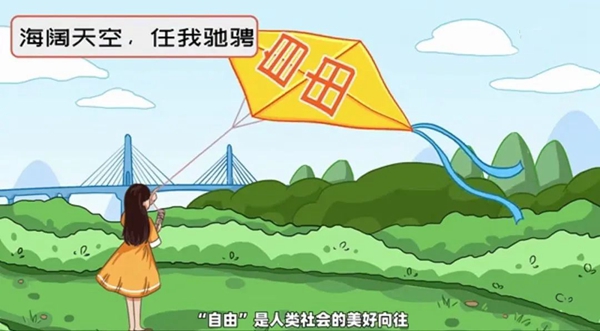 社会主义核心价值观,24个字分成3个层面,富强、民主、文明、和谐,是国家层面的价值目标。自由、平等、公正、法治,是社会层面的价值取向。爱国、敬业、诚信、友善,是公民个人层面的价值准则。 如果你对这24个字还感觉有点陌生,不妨来看下面这组漫画。 富强是国家经济建设的要求,是在决胜全面建成小康社会路上,奋力冲刺。