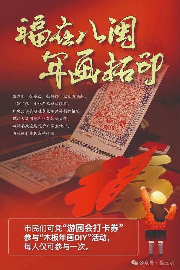 赏年画过大年 龙腾绿都闹元宵 时间:2024年2月24日(元宵节) 地点:三明沪明情文化街区(位于三明市三元区新市北路沪明小学附近) 活动内容:本次“龙腾绿都‘明’俗节主题活动,结合“明”味风情进行新春氛围设计5大打卡点,市民到现场领取一站式门票打卡券,凭券可参与5大打卡点活动集章(每个点位一个章),集齐4个印章及以上,即可至“打卡券兑奖区”兑换一份精美小礼品,数量有限,兑完即止。本券参与各活动及兑奖仅限活动当天使用,过期无效。 沪明风情灯谜会 大红灯笼高高挂起,各式各样的灯谜迎风飘扬、红红火火,本次灯谜在结合中国传统文化的基础上,还植入富有上海元素的谜题,意在续写沪明情,携手向未来。