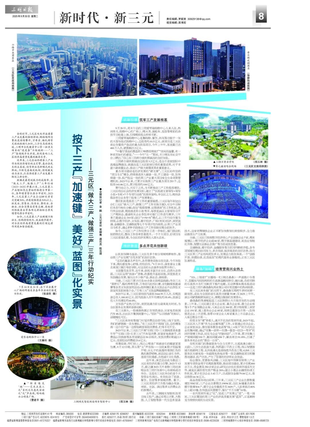 金秋时节,三元区处处洋溢着第三产业发展的强劲律动:购物场所消费热度持续攀升,万寿岩、格氏栲等文旅地标游人如织,三沙生态旅游大道、三明市全民健身中心等一批重点项目的“进度条”不断刷新……“三产”各领域齐头并进,共同奏响三元区经济高质量发展的激昂乐章。 近年来,三元区始终将第三产业作为促经济增长的主引擎、惠社会民生的主渠道、培育新业态新模式的主阵地,不断完善相关机制,持续激发动力活力,扎实推进第三产业发展不断迈上新台阶。 爱琴海购物中心一角 (王雁玲 摄) 数据是最有说服力的成绩单。自“做大三产、做强三产”三年行动(2023-2025)开展以来,三元区第三产业增加值总量始终保持全市第一位,各年增量皆位居全市前列。2023年,三元区第三产业占GDP比重首次突破50%,并连续保持在50%以上,批发业、零售业、住宿业、餐饮业、金融业、社会消费品零售总额、其他营利性服务业等各项支撑指标总量及增量均居全市前列。 如今,三元区第三产业规模不断壮大、结构持续优化、效益稳步提升,对全区经济高质量发展的引领支撑作用更加坚实稳固。 机制引领 筑牢三产发展根基 9月20日,周末午后的三明爱琴海购物中心人来人往,热闹非凡。购物中心的广场上,喷火秀、独轮车、变脸等精彩的杂技节目轮番上演,引得现场观众欢呼不断。 三明爱琴海购物中心是集购物、餐饮、休闲等功能于一体的大型体验式购物中心,总投资约10.5亿元。该项目是三元区商业存量资产盘活的重点改造项目,今年上半年,客流量已达400万人次,销售额达2亿元。 希尔顿欢朋酒店 (徐碧街道供图) “中餐厅菜品的摆盘和口味都很精致!”“房间很温馨,有一种宾至如归的感觉。”……今年“五一”期间,不少网友在社交平台上晒出了自己在三明希尔顿欢朋酒店的良好体验。 三明希尔顿欢朋酒店总投资3.2亿元,是全市首家国际中高端品牌酒店。该酒店是三元区招商引资的重要成果,对于丰富六路商圈业态、推动三产做大做强更具有重要意义。 六路中央商务区(三元区发改局供图) 重点项目建设是经济发展的“硬支撑”,三元区始终坚持“项目为王”理念,持续推进深入储备一批、开工建设一批、加快续建一批、投产投运一批的第三产业重大项目库全生命周期管理机制。2023年以来,已累计实施第三产业重点项目253个,总投资143.86亿元,累计投资约100亿元。 聚行动之力,兴实干之风。为不断推动三产工作提质增效,三元区结合社会经济发展实际,建立了“区政府主要领导+领导小组+专班+7个专项行动组”的组织架构,举全区之力,吸纳各级各单位业务骨干投身三产发展事业。 强化机制是推进三产工作的重要前提。三元区每年制定出台《三元区“做大三产、做强三产”工作实施方案》,对全年目标任务进行细化分解;制定“提级管理、定期磋商”的工作机制,进行例会协调、现场推进和小组考评,每季度由区主要领导召开三产现场会,邀请相关企业参加并对部门工作进行测评,三年来已邀请企业210家;创立“1+N+X”模式,以三年行动方案为纲领,以数字经济、文体旅、楼宇经济、广场(夜间)经济、商贸流通、金融服务、交通物流等七个专项计划为依托,以第三产业项目为抓手,通过多种手段推动三产工作效能实现全面跃升。 如今,三元区三产工作权责分工进一步细化,部门联动机制持续优化,整体工作效率显著提升。一个个大项目、好项目在三元区接连扎根,为全区经济发展注入源头活水。 精耕赛道 多点开花共创新绩 三钢万寿岩学院 (郑玉林 摄) 以机制保障为基础,三元区在多个细分领域精耕细作,推动第三产业呈现“百花齐放”的良好态势。 “这里的氟泉名声在外,各类健身设施也很完备。今天体验下来,确实感觉身心舒缓,轻松自在。”9月19日,游客姜女士慕名来到三钢万寿岩学院,对这里的生态康养体验赞不绝口。 文旅繁花竞芬芳。近年来,依托丰富历史文化、自然生态资源,三元区运用“旅游+”思维,改善提升基础设施,深度推进文体旅融合发展,催生出不少新产品、新业态、新场景。 目前,三元区已累计打造10余条文旅精品线路;举办三元“蕉野乐”、格氏栲栲花季、万寿岩马拉松比赛、皮划艇桨板邀请赛等各类文体旅宣传活动;组织辖区重点文旅企业外出参加文旅宣传及招商推介会,“万寿三元”文旅品牌越擦越亮。 2023年以来,三元区接待国内游客2164.99万人次,实现旅游总收入180.83亿元。国内旅游人次年均增长约55.4%,旅游总收入年均增长约60.8%。 文体旅产业热力四射,商贸流通方面也迎来高光时刻,为全区服务业发展再添新动能。 在三元街头,一股焕新热潮正在悄然涌动。从家电卖场到汽车4S店,从社区市集到商圈中心,“国补”“以旧换新”的标识、话题随处可见。 “三元区商务局等部门对促消费活动进行线上线下宣传,我们的销售额一直在增长。”在三元区苏宁易购门店,总经理陈涛一边介绍产品一边帮助顾客领取消费券,忙得不可开交。 2023年以来,三元区已开展“乐购三明·三元新闽菜美食嘉年华”“乐购三明·乐享三元”汽车促消费、家装家电焕新节、消费品以旧换新等各类促销活动30余场次,发放消费补贴超2.3亿元,直接拉动消费超23.6亿元。 “街角遇见‘她’——艺术点亮三元”系列文化惠民活动之“元”声在线,唱响瑞云山喷泉广场。 (曹建平 