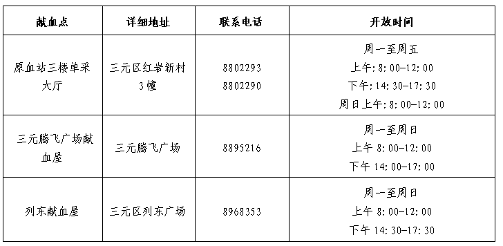 亲爱的市民朋友们: 生命,因血液而奔流不息,目前血液尚无法人工合成,无偿献血不仅是保障医疗临床用血的需要,更是连接生命与希望的纽带,体现的是一份沉甸甸的社会责任感。 大量科学研究证实:健康成年人每次捐献200-400毫升血液(仅占人体总血量的5%-10%),身体能迅速调节补充,不仅无损健康,还能促进新陈代谢。 当前,我区临床用血需求持续增长,血液储备面临压力,为保障医疗救治的血液供应,守护我们共同的生命线,三元区卫生健康局、区委文明办、区妇联、团区委、区红十字会联合向全区适龄及健康公民发出诚挚倡议: 请您在身体条件允许的情况下,勇敢地伸出臂膀,加入无偿献血的光荣行列! 您的每一次挽袖,都是照亮他人生命的一束光。这份无私奉献,不仅为需要帮助的人带去希望,更是城市文明风尚的生动体现,是构建温暖三元、健康三元的坚实力量。 为了让您的爱心之旅更加顺畅、安心,向您提供以下信息和支持: 一、献血温馨提示 献血请携带:本人有效身份证件; 献血条件:年龄18-55周岁(多次献血者可延至60周岁);男性体重≥50公斤,女性≥45公斤;女性请避开月经期及前后三天。 献血前:避免空腹,饮食宜清淡;保证充足睡眠,不饮酒,一周内无感冒、服药等情况。 二、献血点信息 多个安全、规范的献血点均有专业医护人员为您提供全程服务: