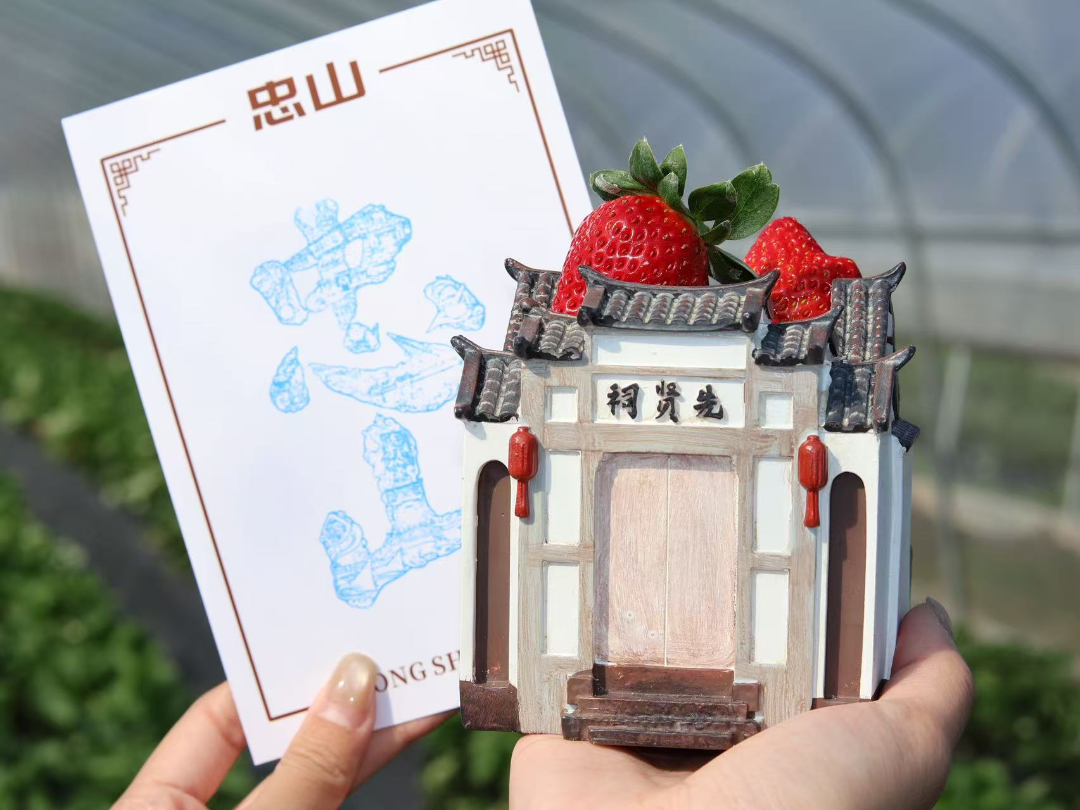 农文旅融合逛遗址+采草莓的双重乐趣 忠山村的美好从不止于舌尖,更是串联起远古文明与田园风光的沉浸式体验: 上午:走进沪明合作农业示范点的草莓大棚,亲手采摘红彤彤的妙七草莓,近距离感受“高校智囊+乡土实践”的农业创新力量→下午:打卡万寿岩国家考古遗址公园,触摸20万年前的人工石铺地面,和岩宝同款形象合影,在“百年栲、千年寨、万年居、亿年泉”中感受时光沉淀→晚上:到万寿岩公共品牌体验中心,品尝特色台湾美食,把新鲜草莓和岩宝主题文创一同打包,让远古文化与田间美味成为旅途的双重纪念