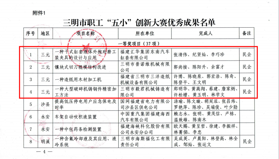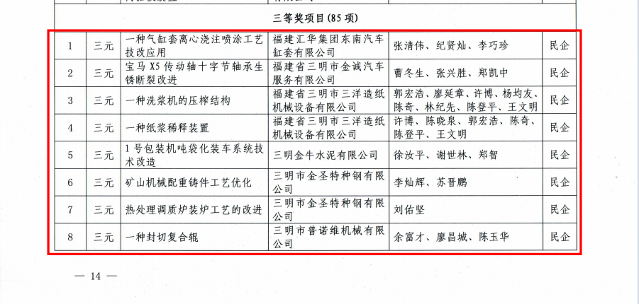 近日,三明市总工会发布《三明市总工会、三明市科学技术局、三明市工业和信息化局、三明市市场监督管理局关于公布2025年三明市职工“五小”创新大赛优秀成果和优秀组织单位的通知》,三元区有17项创新成果榜上有名,其中一等奖4项、二等奖5项、三等奖8项。 获奖名单