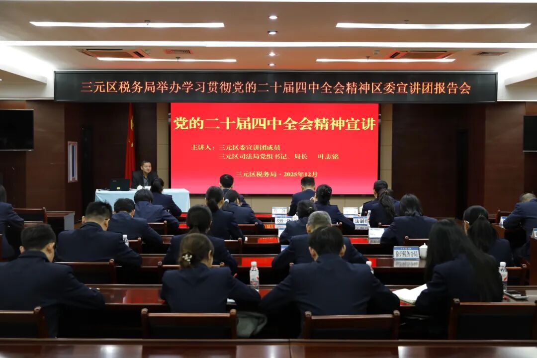 宣讲会上,张晓辉围绕深刻领会党的二十届四中全会重大历史和现实意义、深刻领会“十五五”时期的总体部署、全面理解“十五五”时期的重大任务等方面,结合三元区农业农村发展实际,探讨如何将全会精神转化为推动工作的强大动力,切实扛起新时代“三农”工作的使命担当。 三元税务 12月18日,区委宣讲团成员、区司法局党组书记、局长叶志铭到三元税务宣讲党的二十届四中全会精神。