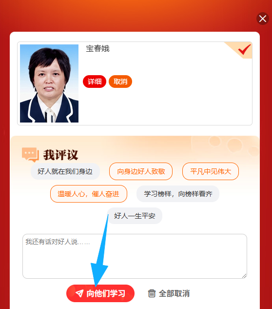 点击“向他们学习”,即点赞成功! 03 最后,动动手指将您支持的好人发到朋友圈,让身边的亲朋好友们一起向他们学习吧。 推荐心中的平民英雄 您的意见很重要 我们期待您的参与! |