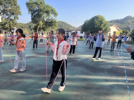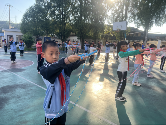 绳索破风,少年起舞。当音乐响起,20名忠山村小学的孩子身着统一服装,迈着整齐的步伐登场。随着节奏变化,他们时而快速跳跃如灵动的小鹿,时而组队造型似绽放的花朵,交叉跳、转身跳等轮番上演,动作行云流水,节奏清脆。孩子们脸上满是专注与自信,每一次起落都精准默契,赢得在场观众阵阵喝彩。 一根跳绳,连接乡村与城市的体育梦想