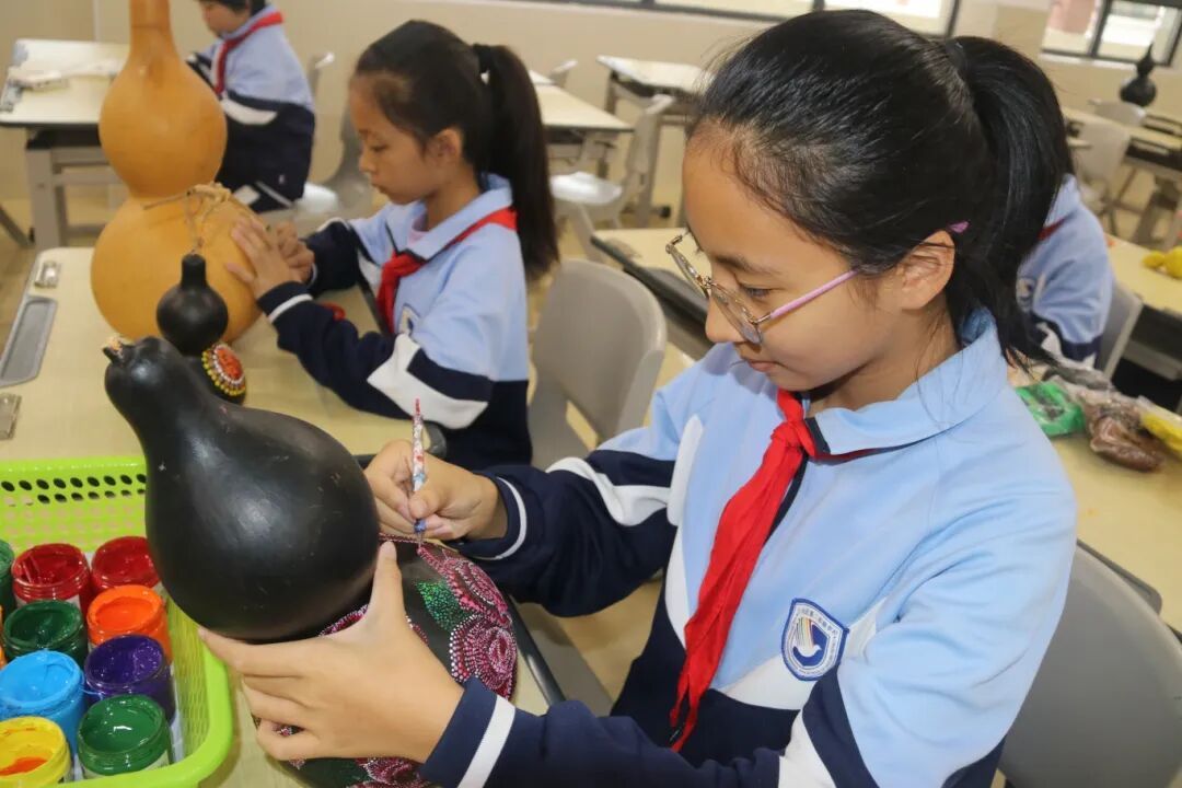 晨光里,葫芦工坊的掐丝流光与非遗乐器的婉转旋律交织;暮色中,校园舞台的璀璨灯光与少年学子的自信笑容相映……围绕“我和我的三明”城市文化主题,三元区深耕“艺术点亮三元”品牌建设,将美育融入教育血脉,以“一校一品一特色”为抓手,让艺术之花绽满校园,让本土文化浸润童心,在一所所校园间书写着精神共富的育人篇章。 课程融情,让本土之美扎根成长 “葫芦上的荷花,是三元的灵秀;指尖的掐丝,是家乡的记忆。”三元区第二实验学校的葫芦画课堂上,学生们以本土风物为灵感,在方寸葫芦上勾勒“我和我的三明”。作为“艺术点亮三元”的重要实践,三元区第二实验学校深耕校本课程建设,将三明本土文化元素融入艺教,开设葫艺、陶笛、巴乌等特色课程,组建6类27项艺术社团,以“抓特长、抓素养、抓展示”三阶段引导,让学生在创作中读懂家乡之美。创新构建的“融+课程”体系更打破学科界限,语文课堂品读三明山水诗文,美术课堂描绘麒麟山、沙溪河风光,音乐课堂传唱《三明后生仔》等本土歌谣,让“我和我的三明”成为美育的鲜活教材。