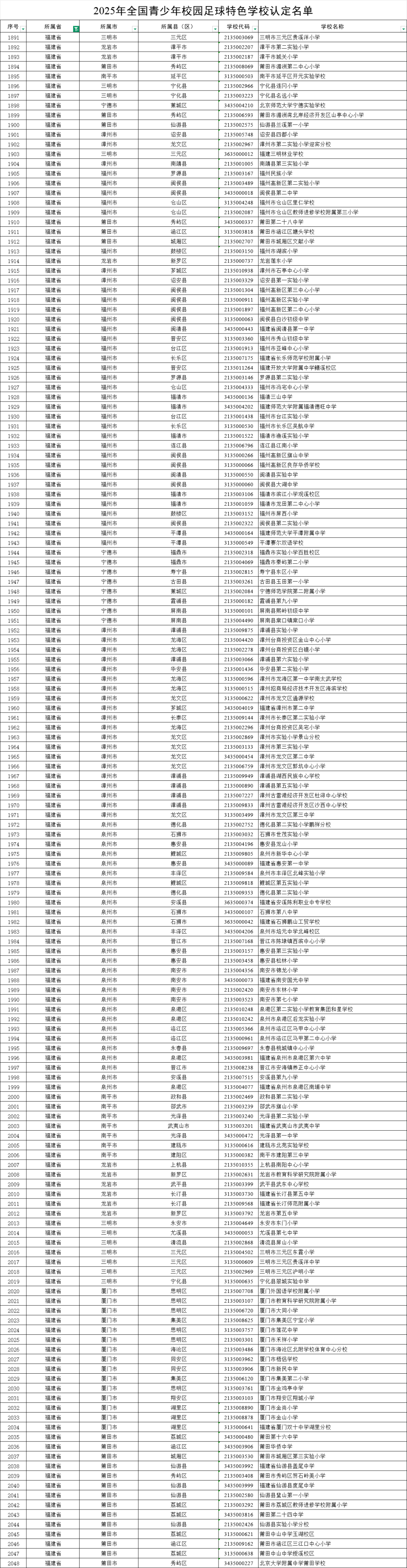 为贯彻落实《中国足球改革发展总体方案》,教育部组织开展2025年全国青少年校园足球特色学校遴选工作。根据《教育部办公厅关于开展全国示范性特色学校创建的通知》(教体艺厅函〔2025〕37号)要求,经有关学校自主申报、专家评审、省级教育行政部门审核推荐、社会公示、专家复核等程序,拟认定2025年全国青少年校园足球特色学校4928所(名单见附件)。现予以公示,公示期为2026年1月27日至2026年2月2日。 公示期内,如有异议,请以书面形式反映情况(信函以到达日邮戳为准)。反映情况须客观真实,以单位名义反映情况的材料需加盖单位公章,以个人名义反映情况的材料应署实名并提供有效联系方式,逾期或匿名反映不予受理。 电子邮箱:xiaozuban@moe.edu.cn 通讯地址:北京市西城区大木仓胡同35号教育部体育卫生与艺术教育司,邮政编码:100816。 附件:2025年全国青少年校园足球特色学校认定名单 教育部办公厅 2026年1月27日 2025年全国青少年校园足球特色学校认定名单(福建省)