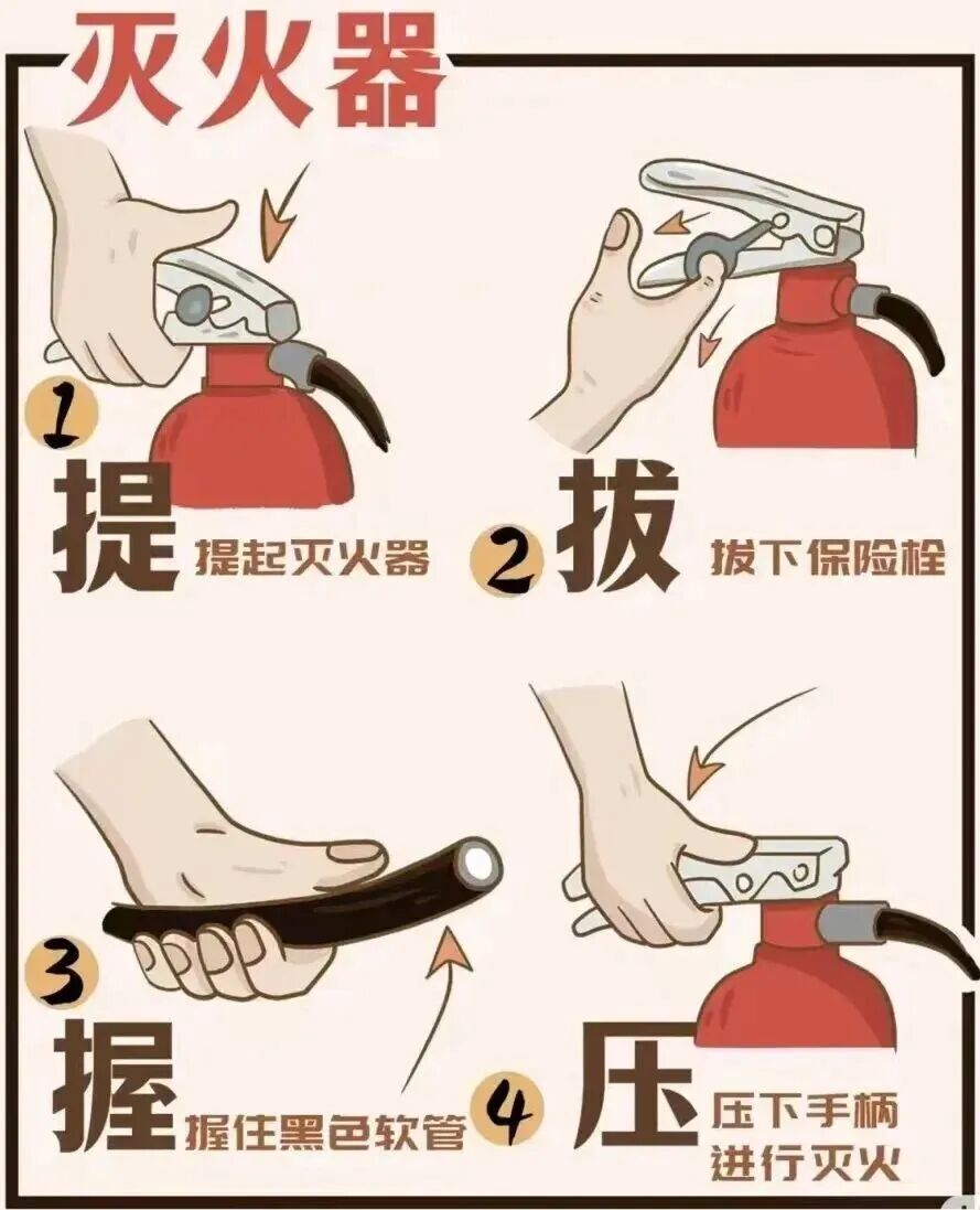 灭火器使用牢记四字口诀“提拔握压” 提:提起灭火器 拔:拔掉保险销 握:握住软管顶部喷嘴 压:对准火源根部压下把手 时刻牢记消防安全 让平安与喜乐相伴 |