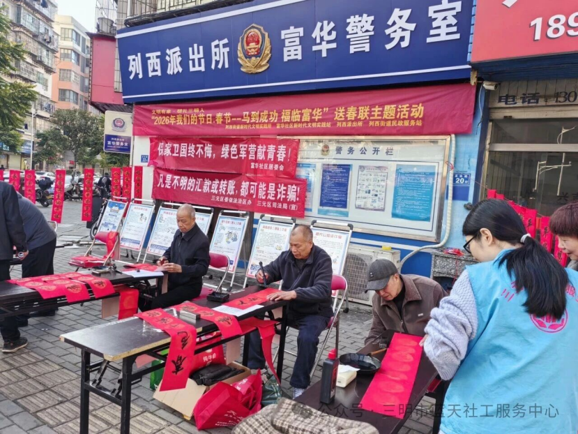 站点协同,贴心服务在身边 各民政服务站积极发挥前沿阵地作用,成为系列暖心活动的枢纽。在陈大镇,一场“平安相伴·新春暖心行”活动,巧妙融合了消防安全知识科普与物资发放,为50户家庭送上“安全+温暖”的双重礼包。在列西街道,“志愿暖家·福联迎春·民生送暖”系列活动同步展开:社工带领志愿者上门为困难家庭打扫房屋,窗明几净迎新年;社区广场上,书法家现场挥毫送春联,墨香四溢;政策宣讲与防诈科普穿插其间,守护居民安心过节。这些多彩服务,让节日的关怀更加具体可感、深入民心。