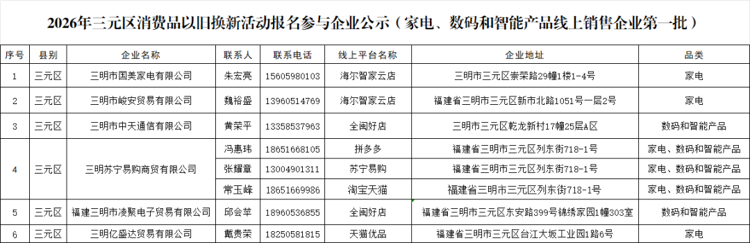 根据三明市商务局《关于征集三明市2026年家电以旧换新、数码和智能产品购新活动参与企业(第一批)的公告》文件精神,经企业自主申报,三元区商务局审核,现将2026年三元区消费品以旧换新活动报名参与线上、线下销售企业(家电、数码和智能产品第一批)予以公示。公示时间2026年4月15日至17日(三个工作日),如有异议,请在公示期内书面形式实名向将三元区商务局反映。 联系电话:0598-8213099 附件:1.2026年三元区家电、数码和智能产品线下销售企业公示(线下门店) 2.2026年三元区家电、数码和智能产品线上销售企业公示(线上销售企业) 三元区商务局 2026年4月14日 附件:1.2026年三元区家电、数码和智能产品线下销售企业公示(线下门店)